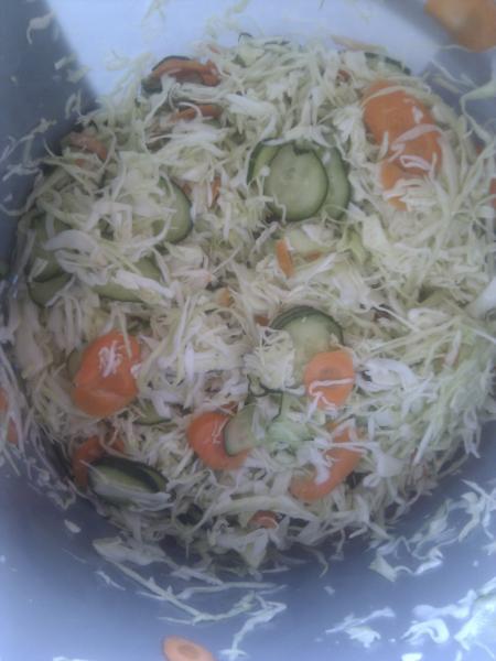 A hozzávalókat megmosom és felvágom. Ha kész sózom, cukrozom, ecetet és tartósítót teszek rá és jó alaposan összekeverem. 24 órát állni hagyom, mielőtt fogyasztanám.