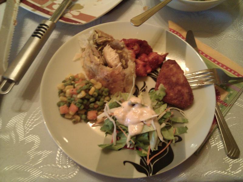 A leveles tészta közepébe öntöm a felét a tojásos-gombás masszának, majd ráteszem a csirkemelleket és a maradék masszát. A tésztát feltekerem és sütőpapíros tepsibe teszem és pirosra sütöm.