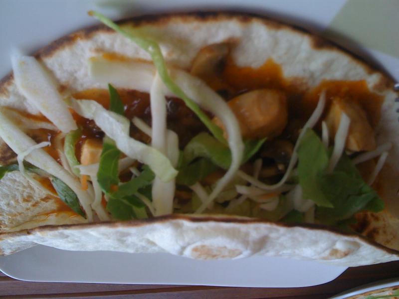 Tortilla gombapörkölttel és zöldséggel töltve